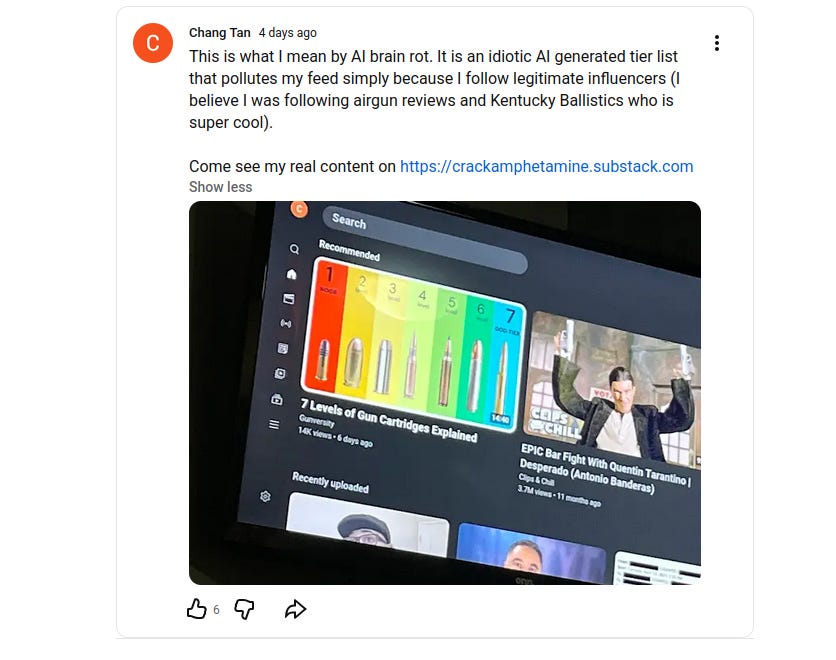 It is idiotic. And the only reason why the slop was suggested to me was because I subscribed to Brandon Herrera, and I also subscribe to Kentucky Ballistics. But so, what happens is you subscribe to these, and the problem is that if you’re on your mobile app, subscribing to a legitimate influencer, you get AI slop on top of it. If you scroll your phone or if you don’t move your controller to the left or right fast enough, it actually gets played. That counts as a play, which lies to Google or YouTube that you’re actually interested in the slop, which counts as a watch to these AI slop scammers.
