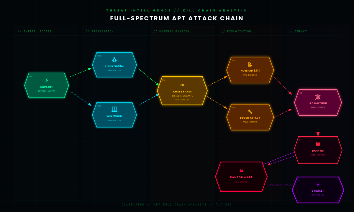 By utilizing a highly compatible shell script, the objective is to locate a Windows machine within the LAN and immediately deploy ransomware or additional lateral movement tools. The goal is to pivot from a public-facing Linux endpoint to the internal Domain Controller, potentially compromising the entire forest. From there, the attack scales using threaded runspace pools to distribute ransomware, credential stealers, and other malware across the domain. This entire chain—from exploit to corporate-wide impact—is made possible by automating privilege escalation through vulnerabilities like Notepad++ 8.8.1 or Velociraptor-based exploits.