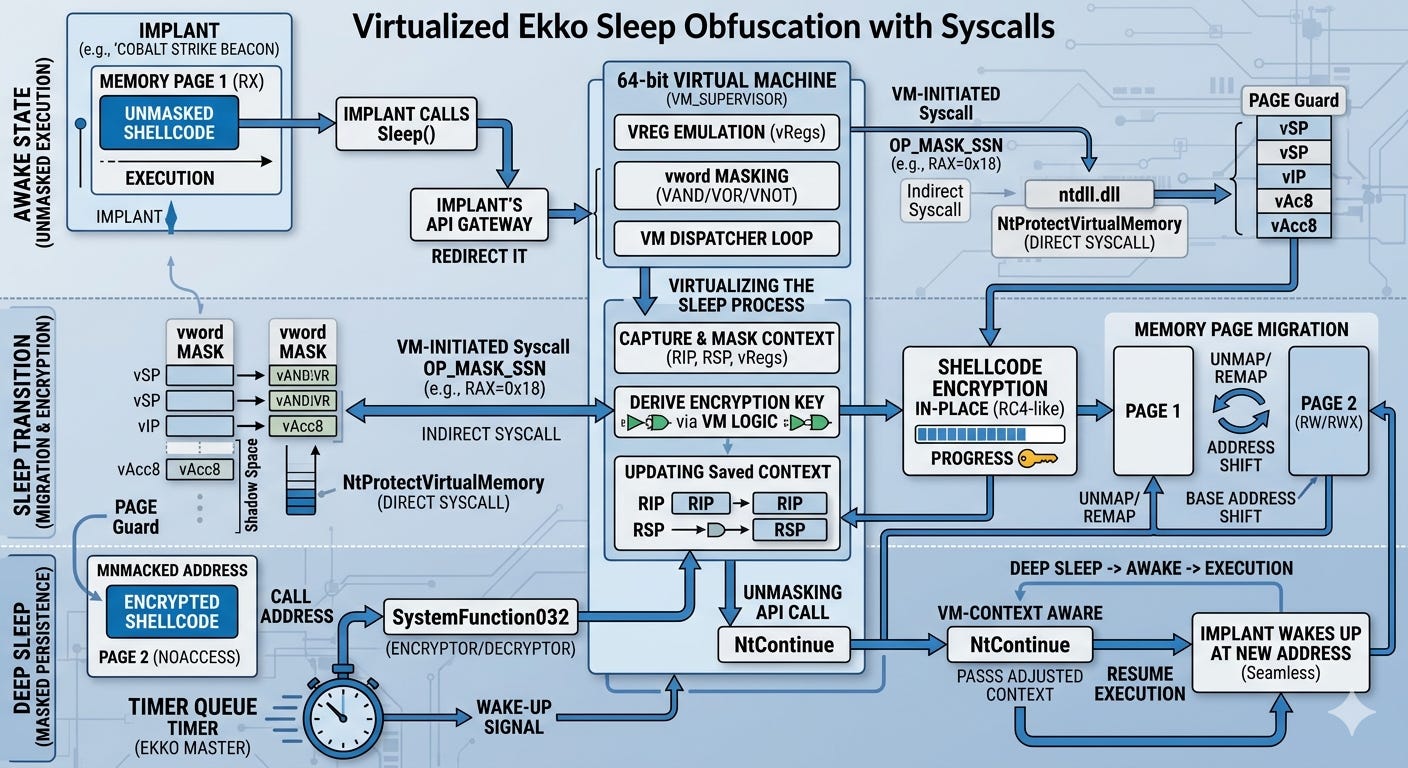 The superior third method is to integrate the VM obfuscator I provided with Ekko sleep obfuscation. You can flip the memory page protection using NtProtectVirtualMemory combined with direct or indirect syscalls, then utilize NtContinue. This approach is tailored for asynchronous payloads, such as Cobalt Strike Beacons, Havoc Demons, or Brute Ratel Badgers. By integrating the VM with the sleep obfuscation, you treat Ekko as the ‘Master’ controller, and the shellcode automatically virtualizes the Ekko sleep process itself.”